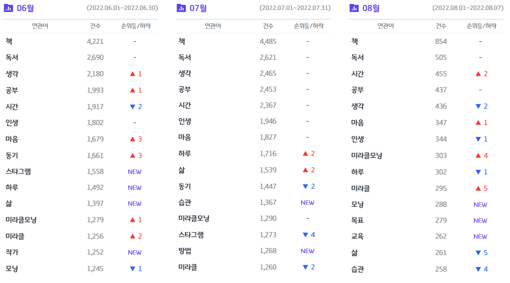 그 밖에도 '자기계발'은 '미라클모닝', '습관'과도 연관되어 있었는데 6월을 지나 7월을 거쳐 8월까지 꾸준히 상승하는 모습이 학생들의 방학과 관련되어 키워드가 상승한 것이라고 추측해 볼 수 있다.