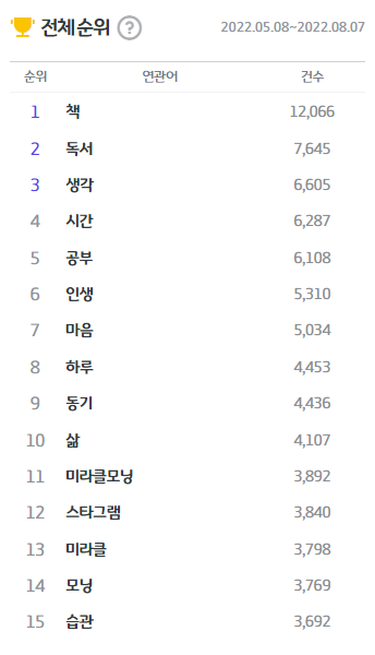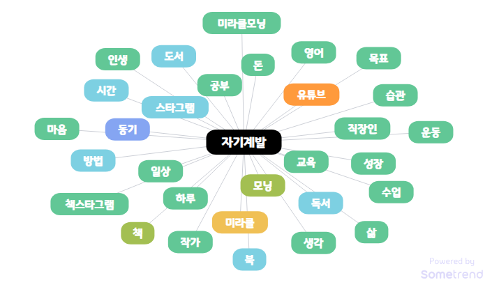 2022년 5월부터 2022년 8월까지 자기계발과 관련된 키워드를 검색해 보니 역시나 '책', '독서', '공부' 등과 '인생', '생각', '동기' 등의 키워드가 상위권에 있음이 숫자로 확인되었다. '자기계발' 하는 사람들이 관련 책을 많이 읽는 것일 수도 있고 그냥 책을 읽는 것이 자기계발인 것일 수도 있지만 어찌 되었건 '자기계발'은 '책', '독서', '공부'를 통한 '인생', '생각', '동기'와 연관성이 깊었다.