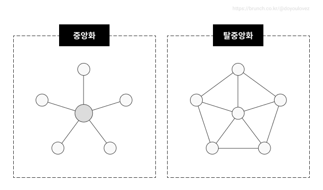 반면 탈중앙화 조직은 권위를 가진 중앙이 없다. 특정 주체가 조직을 운영하는 것이 아니라, 모든 조직 구성원들(=네트워크 참여자)이 참여하며 자율적으로 운영한다. 이때, 모든 조직 구성원들은 평등한 권한을 가진다.