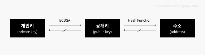 주소는 공개키를 이용하여 얻을 수 있다. 비트코인의 경우 SHA(보안 해시 알고리즘)와 RIPEMD(RACE Integrity Primitives Evaluation Message Digest) 함수에 공개키 값을 대입하여 주소를 얻는다. 반면 이더리움은 Keccak 함수로 주소를 얻는다.