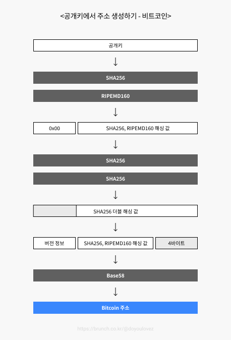 7. 이를 Base58로 인코딩하여 공개키를 압축한다. 이것을 주소로 사용한다.