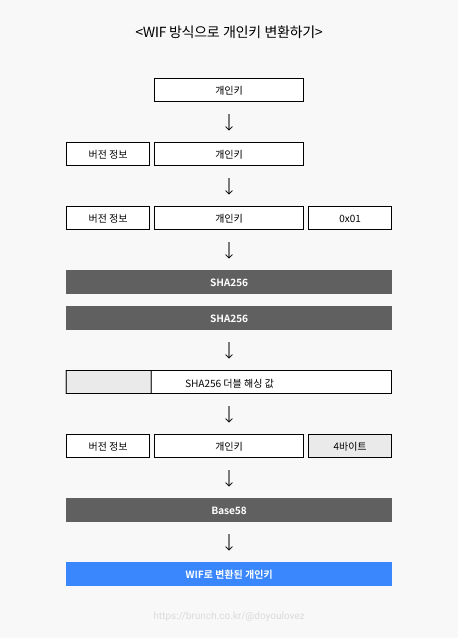 이더리움은 생성한 개인키의 64개 헥사 값을 그대로 사용한다. 반면 비트코인은 WIF 방식으로 키를 변환하여 사용한다. WIF(Wallet Import Format)이란 256비트의 개인키를 Base58Check 인코딩 체계를 통해 표현하는 방식이다. 이 방식으로 개인키를 변환하는 과정은 다음과 같다.