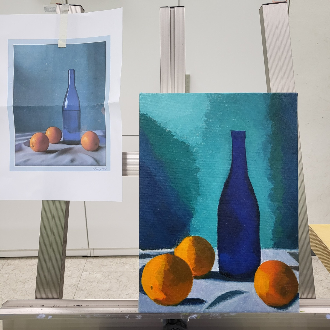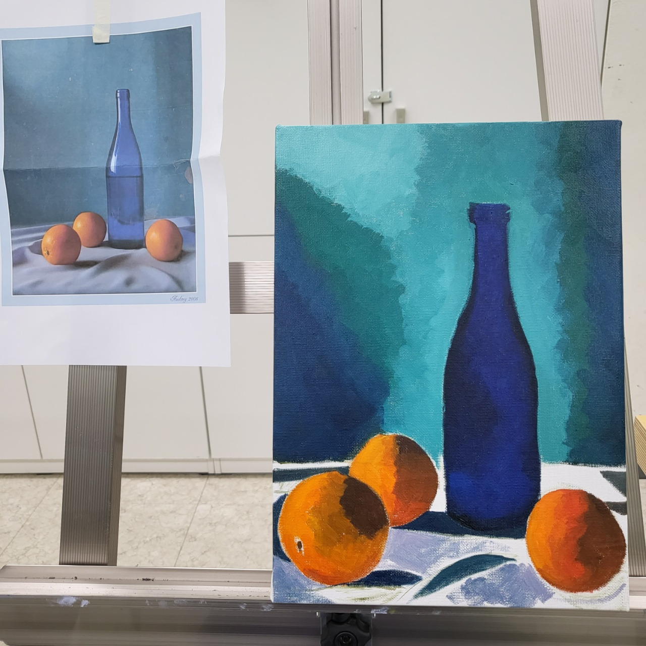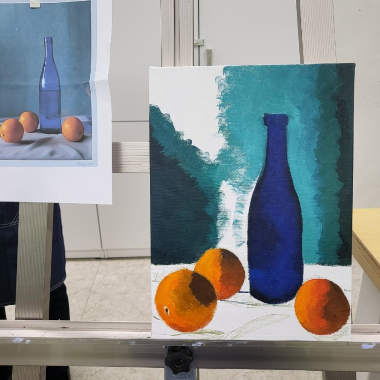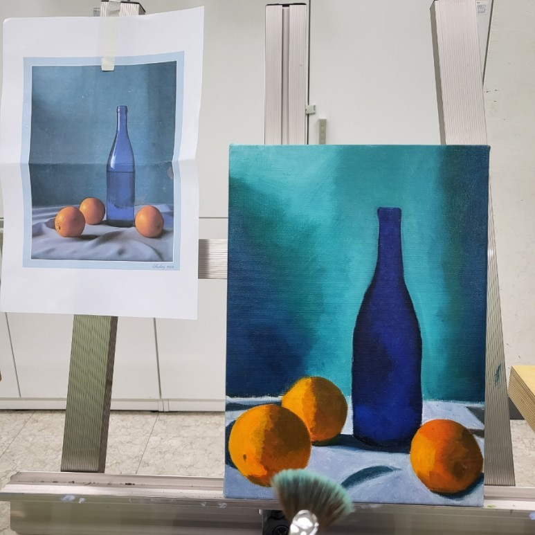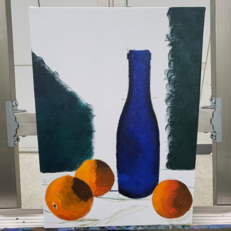 "선생님. 병목을 얇게 수정하려면 하얀색으로 덮어도 되는 걸까요?” 지난번에 병목을 두껍게 그렸기 때문에 수정 없이 귀여운 이미지로 밀고 나갈 수도 있었겠지만. 아직 나는 창작의 묘미보단 똑같이 구현해봄에 뜻이 깊은 초초보 유화 입문자인 것이었다. 선생님의 답변은 “하얀색 아니고 바탕색으로 수정.” 아차차. 이렇게 초보의 사고는 언제나 수정은 단순하게 ‘하얀색 바탕’이고 ‘하얀색 젯소’였던 것이었다. 빨리 수정을 하고 싶어서 성급하게 비슷한 색을 만들어서 병목을 가늘게 보이도록 파란 병의 목을 덮었다.