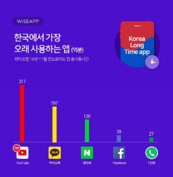 외부 상황도 불안 요소가 있습니다. 동영상 플랫폼을 유튜브가 완전히 장악했다는 점입니다. 동영상 시장 내 유튜브 사용시간 점유율은 압도적입니다. 게다가 범위를 전체 앱 사용시간으로 넓혀 봐도 네이버와 카카오톡을 앞지르기 시작했습니다. 한국에서 가장 오래 사용하는 앱이 된 것입니다.