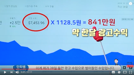 또 한 가지, 제가 높게 평가하는 부분은 자기 수익에 대한 공유가 자유롭다는 점입니다. 크리에이터는 유튜브에서 번 돈을 다른 사람에게 자랑할 수 있습니다. 일례로, 단희쌤은 주기적으로 자신의 수익을 공개하고 있죠. 화면을 보면 구독자 10만 명일 때 월 800만 원 이상을 벌고 있네요. 와, '나도 유튜버나 해볼까'하는 생각이 드시죠? 그래서 초등학생의 장래희망 5위도 유튜버입니다.