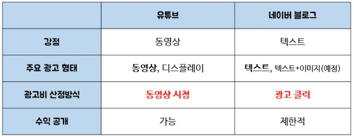 그런데 문제는 앞서 언급한 유튜브의 모델을 네이버 블로그에 그대로 적용할 수가 없습니다. 플랫폼 성격이 전혀 다르기 때문입니다. 유튜브는 동영상 기반이지만 블로그는 텍스트 기반입니다. 그래서 광고 형태가 다르고, 과금 방식이 다릅니다. (같은 이유로 네이버 블로그에서는 광고 노출수, 클릭수, 클릭률 등의 데이터를 외부에 공개할 수 없습니다.) 광고를 자연스럽게 보는 것과 클릭해야 보는 것은 광고 수익 규모에 대단히 큰 차이를 불러옵니다. 즉, 네이버 블로그는 수익을 독점하는 것이 아닙니다. 블로거에게 충분한 수익을 주기 어려운 여건인 것입니다.