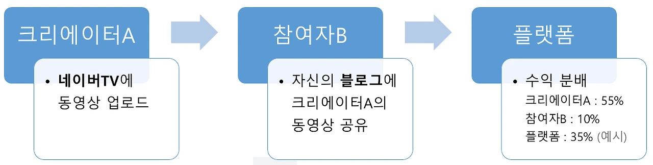 이 과정에서 네이버TV와 네이버 블로그 간 시너지 효과도 자연스럽게 커질 것입니다. 이를테면 A라는 크리에이터가 네이버TV에 동영상을 올리고, 이를 본 참여자 B(블로거)가 자신의 블로그에 공유했을 때 B의 블로그 구독자가 동영상을 시청함으로써 수익이 발생할 수 있습니다. 이때 발생하는 수익을 네이버TV 크리에이터 A와 콘텐츠 확산에 기여한 참여자 B(블로거) 그리고 플랫폼(네이버)이 나누어 갖는 것입니다. 결과적으로, 블로거는 타인의 콘텐츠를 소개하는 활동만으로도 수익을 창출할 수 있습니다. 이때 필요한 노력은 유튜브 영상을 페이스북에 공유하는 수준의 작업뿐입니다.