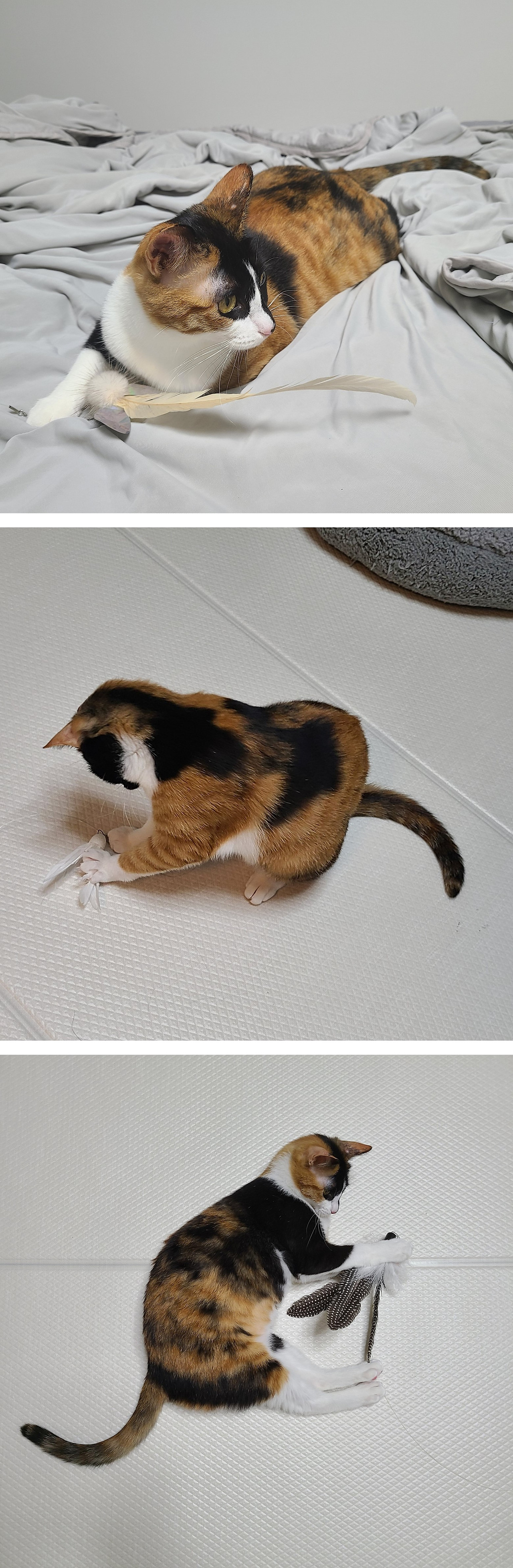 만약 이 중에서 부드러운 갈색 깃털을 고른다면, 연기 컨셉은 ‘방심한 참새’ 정도로 잡는다. 여기서 중요한 건, 연기의 포인트가 ‘참새’가 아니라 ‘방심한’이라는 것. 진짜 참새처럼 날렵하게 움직이거나 강한 경계심을 보이거면 리지는 못 잡는다. 사냥에 자신감을 잃어 풀이 죽을 수도 있다. 따라서 난 ‘고양이가 있을 줄은 꿈에도 몰랐다는 듯 거실 한복판을 유유히 거니는 참새’ 혹은 ‘쉬려고 앉는 곳이 꼭 눈에 잘 띄는 이불 위인 참새’를 연기하는 게 좋다. 전에 실제 참새처럼 캣타워 꼭대기에 앉았더니, 리지가 날 째려보며 울었다. “와 너무하네.”라고 말하는 것 같았다. 계속 성을 내는 리지를 보며 남편은 말했다.