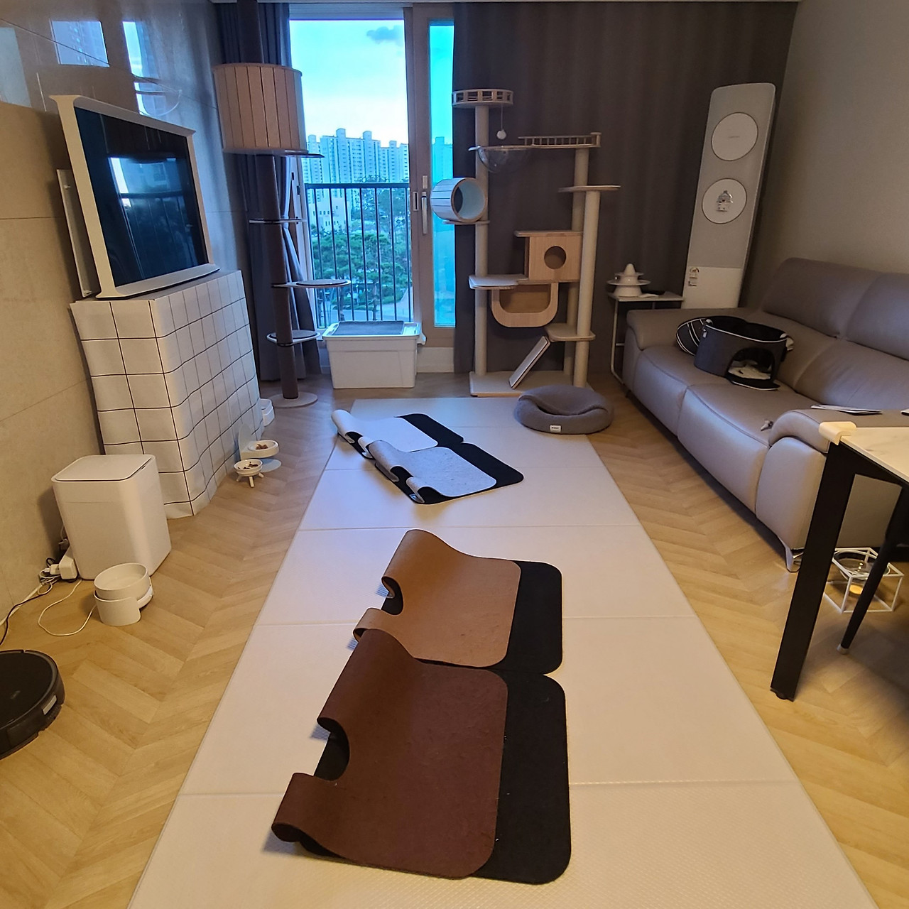 이렇게 리지를 만남과 동시에 우리 집은 사람의 취향과 편의에 맞춘 ‘인(人)테리어’와 이별하고 리지의 안전과 즐거움을 위한 캣(cat)테리어 공간으로 거듭났다. 마치 공룡을 좋아하는 아이를 키우는 집이 각종 공룡 모형으로 가득 차 쥬라기공원(!)으로 변하듯이. 이제 거실은 리지가 먼저 살고 있던 곳에 우리가 들어가게 된 걸로 보일 정도로 리지 물건이 가득하다. 높은 곳을 좋아하는 고양이의 습성을 고려한 캣타워, 고양이 탈구 방지용 매트, 고양이의 사냥놀이를 더 흥미롭게 만드는 캣터널, 고양이 자동급식기, 고양이 물그릇이 여기저기 놓여 있으니까.