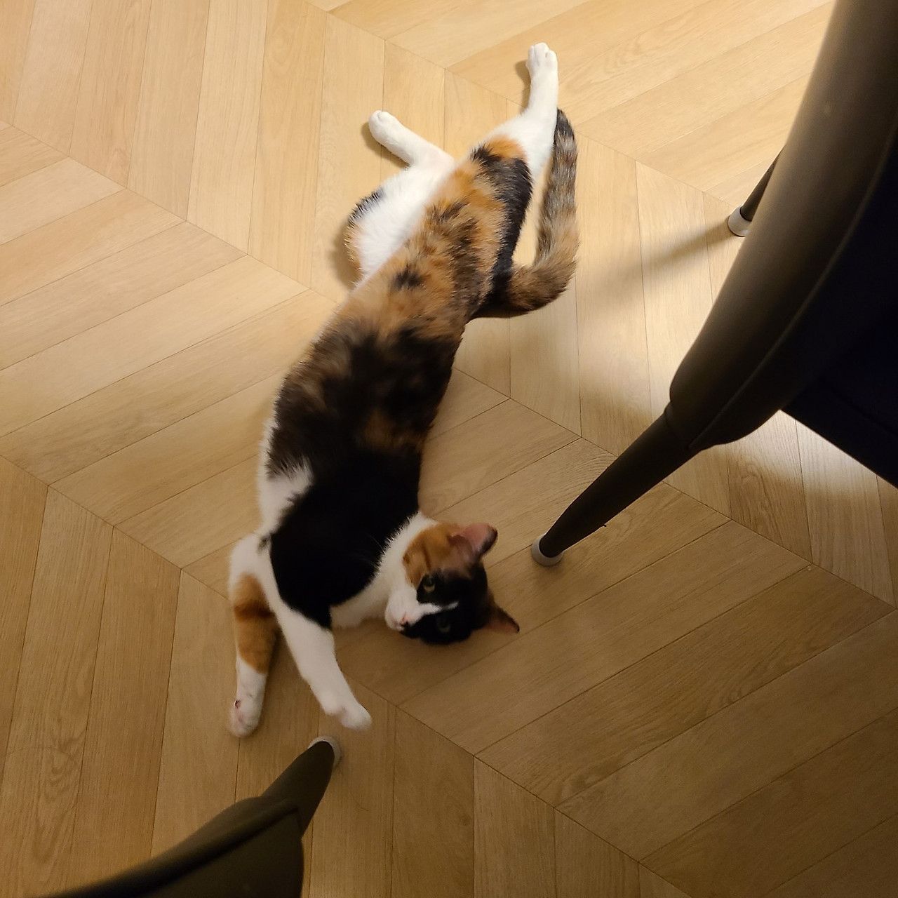먼저 부엌에 생긴 룰은 ‘식탁의자 확 빼지 않기’. 나와 남편이 밥을 다 먹을 때쯤 리지가 근처 바닥에 털썩 잘 드러눕기 때문이다. 리지는 누운 채, 완두콩 콩알만 한 앞, 뒷발의 발가락 사이사이가 다 보일 정도로 시원하게 기지개를 켠 후, 우리가 일어날 때까지 꼬리로 바닥을 툭, 툭 치며 핀잔을 주기 시작한다.