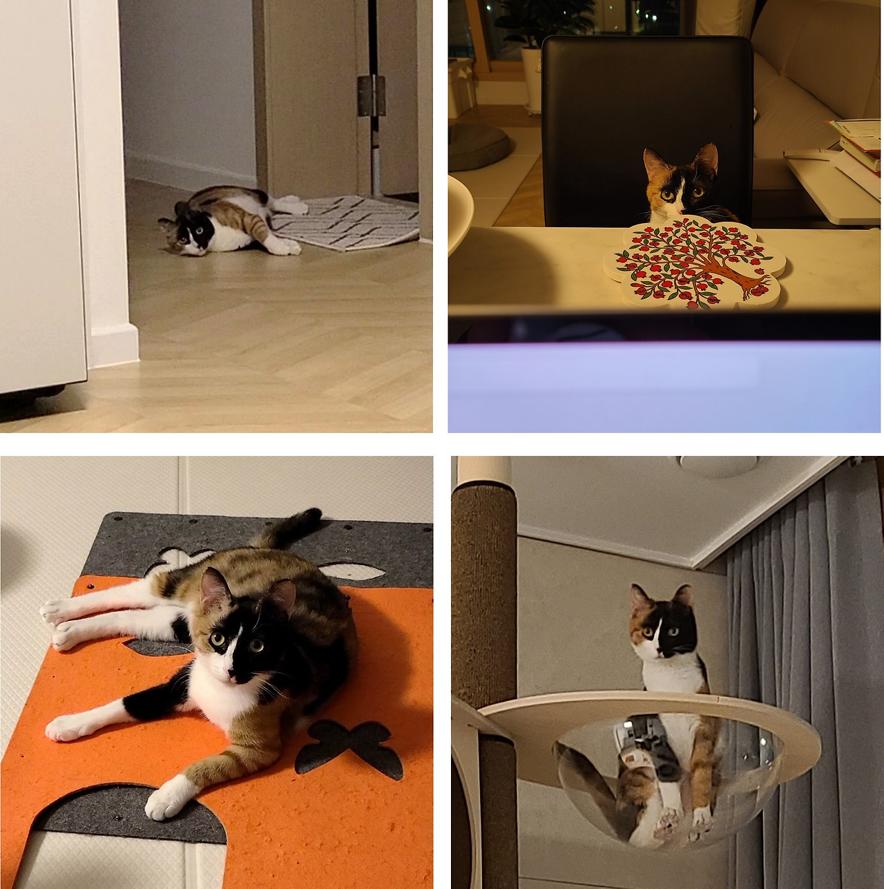 예로 우리가 밥을 먹으려 식탁에 앉으면, 리지는 거실 캣타워 꼭대기의 투명 반구에 앉아 우리를 내려다본다. 우리가 TV를 보려고 소파에 앉으면, 리지는 대각선 방향의 화장실 발 매트 위에 앉아 우릴 올려다본다. 우리가 일을 하려고 책상에 앉으면, 리지는 책상 뒤쪽 방석 위에서 엎드려 우릴 올려다본다. 집안 곳곳에 우리를 지켜보기 좋은 ‘핫스팟’을 마련해 둔 거다.