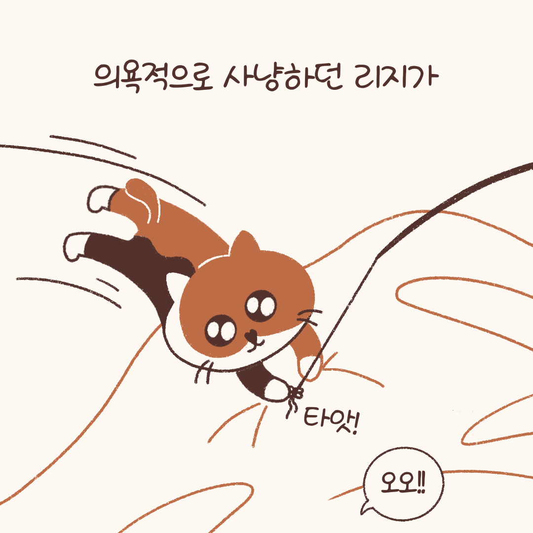 어느 날 기회가 왔다. 마침 내가 화장실에서 양치를 하고 있을 때 리지도 근처의 고양이 화장실로 온 것이다. 리지가 화장실 모래를 파며 거사(!)를 묻을 때부터 난 촬영을 위해 핸드폰 카메라의 동영상 버튼을 눌렀다. ’똥’ 소리가 났다(맥락상 좀 그렇지만 ‘똥’보다 이 소리를 더 잘 표현하는 소리가 없음). 거사를 다 묻은 리지를 보며 곧 총알처럼 튀어 나가는 모습을 찍을 수 있을 거란 기대감에 설렜는데... 웬걸. 리지는 화장실 문턱을 세상 우아하게 넘고선 꼬리를 살랑이며 밖으로 걸어 나갔다. 그리곤 거실 캣터널 위에 살포시 앉아 나를 바라봤다. ’우아한 고양이 처음 봐?‘라고 말하는 듯한 얼굴로. 허탈해서 핸드폰을 든 손이 힘없이 내려갔다.