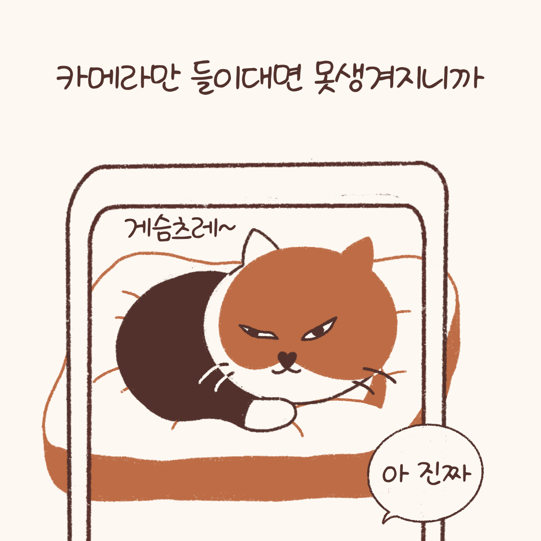 고양이로부터 원하는 A컷을 다 건지는 건 애초에 불가능하다는 말씀이다. 하지만 나를 비롯해 다른 집사들 모두 이 사실을 알면서도 욕심을 내려놓지 못할 것이다. 매번 바삐 카메라를 켜는 ‘찍사’ 집사들에게 <국화 옆에서>의 시구를 패러디한 문장을 헌정한다.