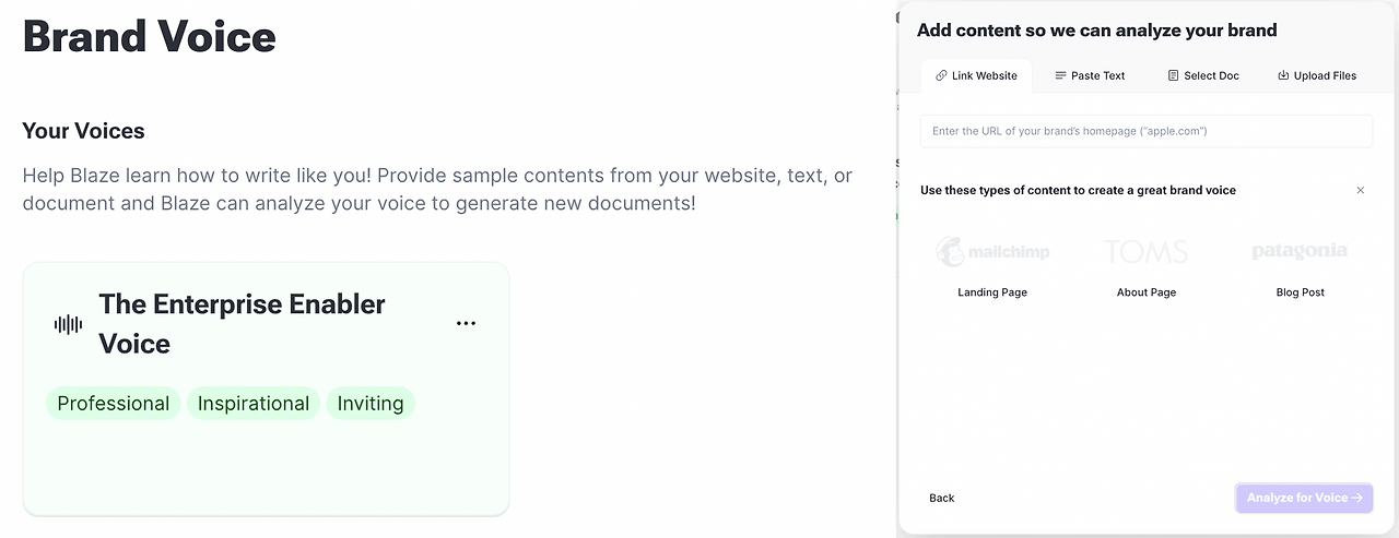 블레이즈에서는 마케팅 콘텐츠를 제작하기 전에 블레이즈가 브랜드 보이스를 습득할 수 있도록 샘플 콘텐츠를 추가해야 합니다. 이는 뤼튼의 툴에서 예제를 추가했던 것과 유사하지만, 텍스트만 입력 가능했던 뤼튼과 달리 블레이즈는 웹사이트 링크, 문서 파일, 텍스트와 같은 자료를 모두 적용할 수 있습니다.