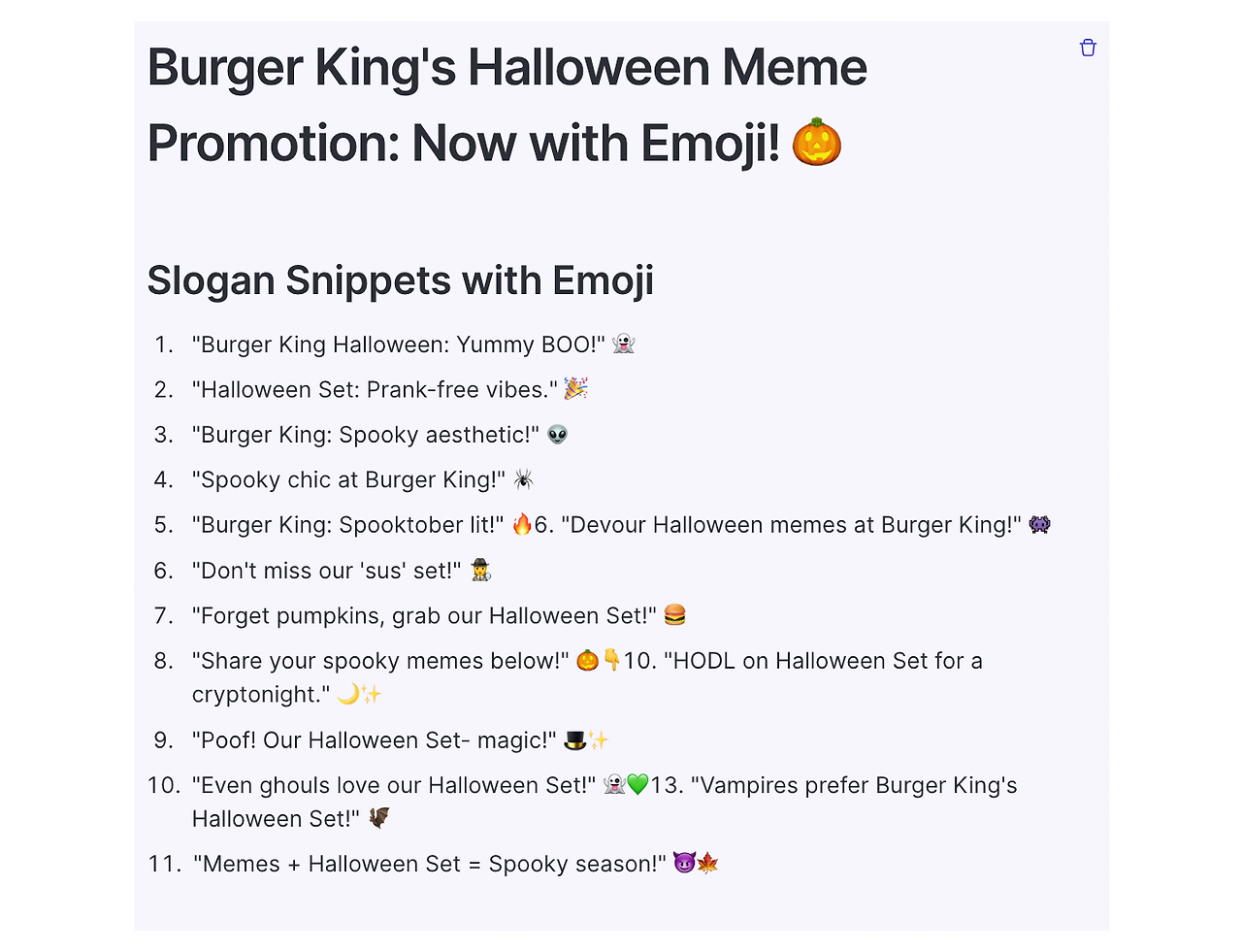 인스타그램 토픽에 핼러윈 콘텐츠를 제작해 달라는 간단한 요구사항을 넣고 재미있는 밈을 활용하라는 조건을 추가했습니다. 이를 통해 제작된 캡션을 살펴보면, 전반적인 톤 앤 매너는 밝고 신나지만 밈이 활용된 듯한 문구가 없고 이모지도 추가되지 않아 인스타그램에 바로 올리기엔 다소 딱딱해 보입니다.