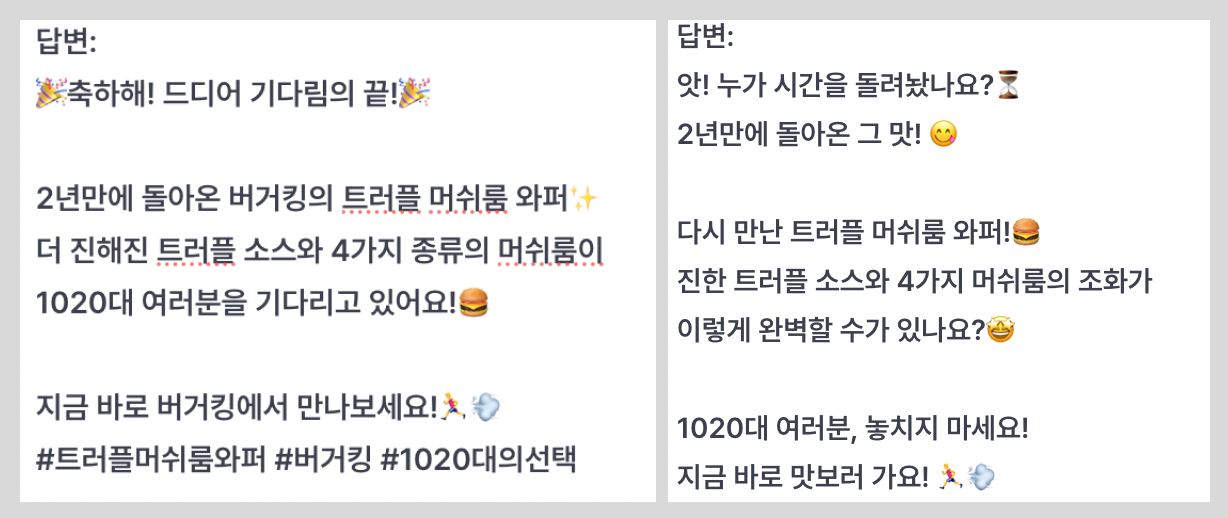 예제를 추가한 결과, 채팅에서 얻은 답변보다 간결하고 실제 버거킹 인스타그램에서 사용되는 캡션 형식을 잘 반영한 결과물이 나왔습니다. 그러나 여전히 밈이나 최신 트렌드를 활용하여 멘트를 구성하는 데는 부족한 점이 보입니다(예제에는 환승연애 밈을 활용한 '우리 2017년에 만났는데 벌써 2023년이야' 멘트가 추가되어 있습니다). 또한, 멘트에서 타깃 유저층으로 지정한 1020대를 직접적으로 언급하는 등 일부 어색한 부분을 찾아볼 수 있습니다(이 부분은 프롬프트 설계에 문제가 있었던 것 같죠).
