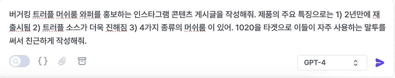 채팅 기능만으로도 꽤 다양한 캡션이 생성되는 것을 볼 수 있습니다. 제작된 캡션을 살펴보면, 인스타그램 콘텐츠에 어울리도록 멘트와 이모지가 적절히 활용되며, 제품의 주요 특징과 타깃 유저층에 적합한 언어 스타일 모두 반영하여 작성되었습니다. 다만, 결과물을 한국 버거킹 인스타그램에서 사용되는 캡션과 비교해 보면 다소 보편적인 문장이라는 느낌이 듭니다. 한국 버거킹 인스타그램의 캡션은 사용자의 참여를 유도하기 위해 밈이나 최신 트렌드를 반영하고 있지만, AI가 생성한 캡션에는 재미와 위트가 부족한 면이 있기 때문입니다.