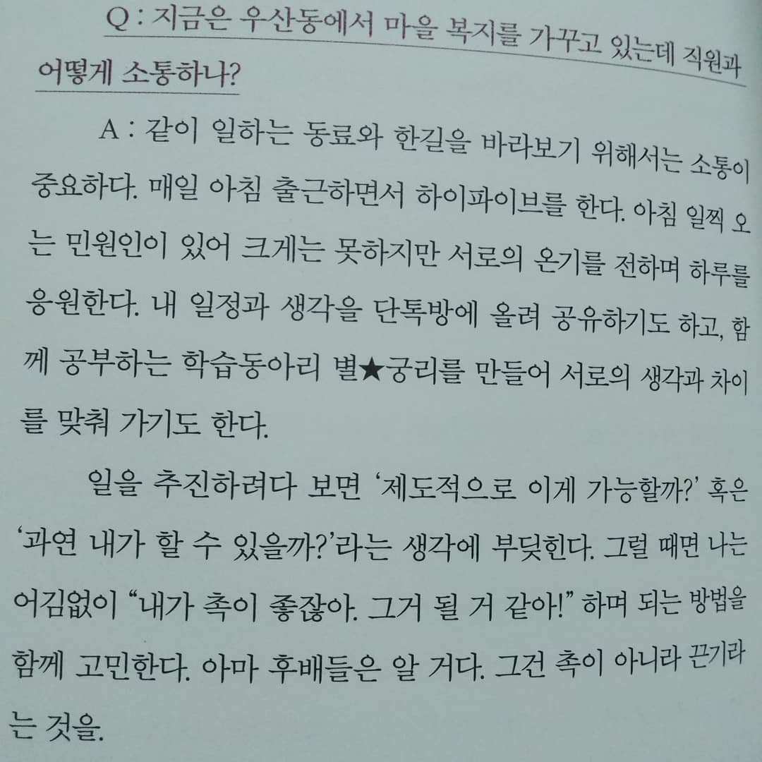 "일을 추진하려다 보면 '제도적으로 이게 가능할까?' 혹은 '과연 내가 할 수 있을까?'라는 생각에 부딪힌다. 그럴 때면 나는 어김없이 "내가 촉이 좋잖아. 그거 될 거 같이!" 하며 되는 방법을 함께 고민한다. 아마 후배들은 알 거다. 그건 촉이 아니라 끈기라는 것을."