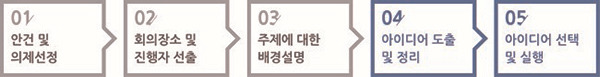 회의를 통해 제시된 아이디어는 주제와 관련성, 문제 해결 가능성, 실행 가능성, 경쟁력 등을 검토 후 최종 선택한다. 선택된 아이디어는 진행 방향에 대해 계획을 수립 후 진행한다.