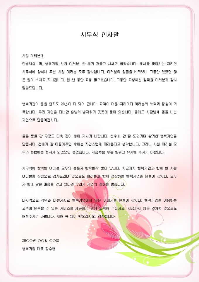 이처럼 시무식은 한 해를 시작하는 만큼 의미 있는 자리가 되어야 하며, 향후 업무에 대해서나 내부적인 단합으로나 무언가 남는 자리가 되어야 할 것입니다.