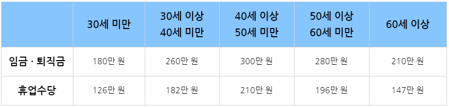 아쉽지만, 국가에서 모든 임금을 지급하기에는 재정에 무리가 있기 때문에 상한선이 있습니다. 퇴직 당시의 연령에 따라 상한액이 다르니 표를 반드시 확인해 주셔야 합니다.
