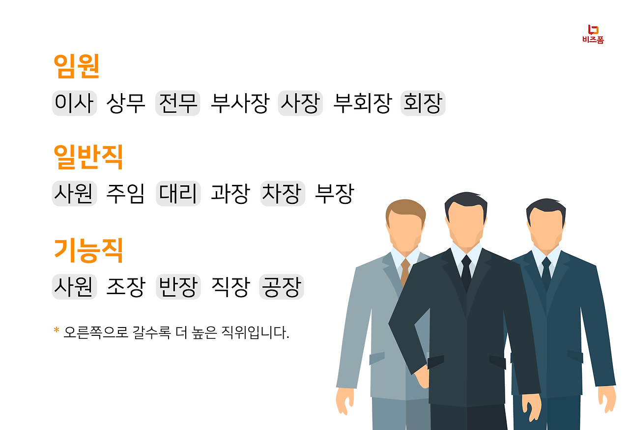 이사 < 상무 < 전무 < 부사장 < 사장 < 부회장 < 회장
