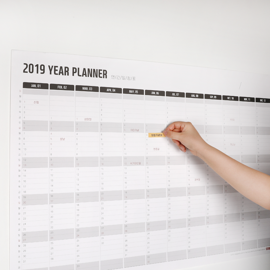 사무실 또는 내 방 벽에 붙여놓고 한눈에 1년 일정을 볼 수 있는 연간 포스터 달력입니다.
