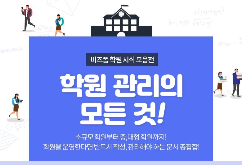 학원을 운영하면서 학원생들 수업만하면 업무가 끝나는 것이 절대 아니죠!우리 원장님들과 선생님들께서는 수업시간 외에도 끊임없이 문서 작업을 하실텐데요.이젠 비즈폼 학원관리 서식 모음전으로당신의 업무시간을 절약하세요!