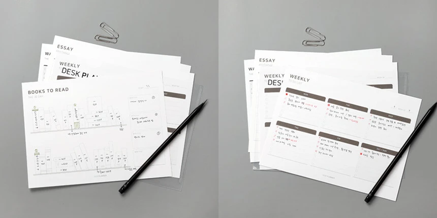 150g의 두께감 있는 백색 모조지를 사용하여, 뒷면이 비치지 않으며 번짐없이 써지는 부드러운 필기감을 느낄 수 있습니다. 종이 콘텐츠는 총 10가지로 구성되어 있으며, 제품과 함께 동봉되어 배송됩니다.