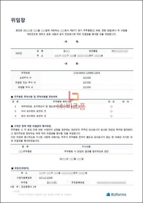 각종 계약 또는 거래에서 대리인에 권한을 위임하기 위한 위임장입니다.