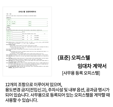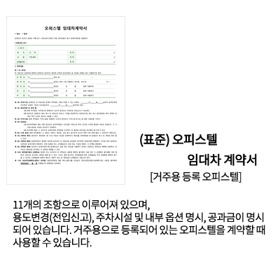 ※ 오피스텔 임대차 계약서는 사무용 기준으로 제작되었으며, 거주용에 해당하는 경우 [용도변경 및 전대]조항을 (거주용)오피스텔 임대차 계약서를 참고하여 변경하시고 [전세권설정]에 관련된 조항을 삭제하여 사용하시기 바랍니다.