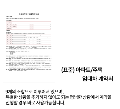 다수의 가구가 살고 있어 층간 소음, 주차공간, 조망권 등의 문제가 있지만 치안이 좋고 목적물 근처에 놀이터, 상가, 집의 크기가 넓어 장점도 많은 아파트나 주택. 다른 목적물보다 큰 금액이 오가는 만큼 임대인과 임차인이 서로 피해를 입지 않도록 상황별로 필요한 조항을 체크하여 계약을 진행해보세요!