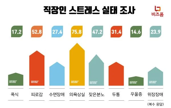 의욕상실(75.8%), 극심한 피로감(52.8%), 잦은 분노와 짜증(47.2%), 두통(31.4%), 수면장애(27.4%), 위장장애(23.9%), 폭식(17.2%), 우울증 공황장애 등 정신질환(14.6%):: 복수 응답