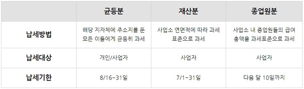 저번 7월에 납부하라고 한 것은 사업자를 대상으로 사업소 면적에 따라 세금을 내는 주민세 재산분이고 8월에 납부할 주민세는 말 그대로 지자체에 주소지를 둔 개인과 사업자에게 과세하는 주민세 균등분인 것입니다.