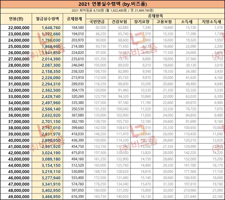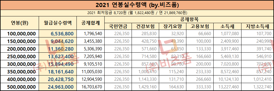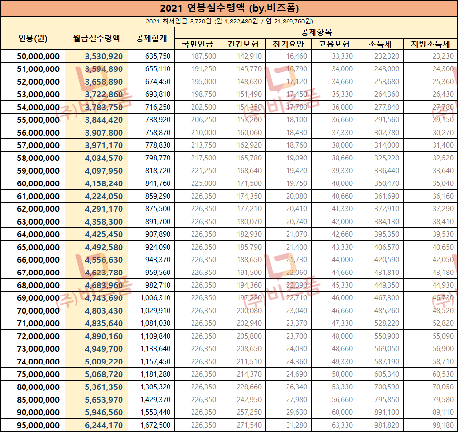 아래 표는 2021년 근로소득세/4대보험요율에 따른 월 실수령액을 표시한 표입니다.