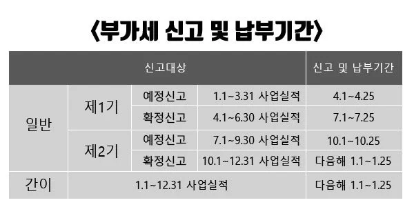 부가가치세는 과세기간은 6개월 단위입니다. 그리고 각 과세기간을 다시 3개월씩 반으로 나눠 매년 총 4번의 신고기간으로 구성되어 있습니다.
