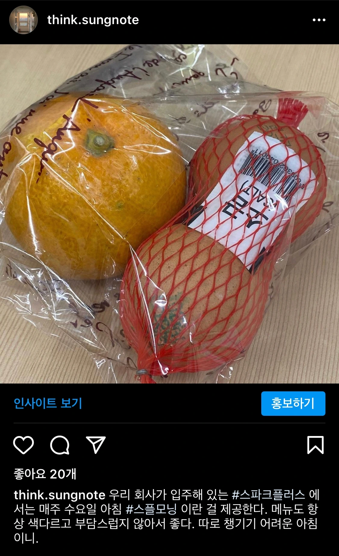 한번은 회사가 입주한 스파크플러스에서 아침에 나눠주는 '스플모닝'이 과하게 포장돼 있어서 문제를 제기한 적이 있다. 인스타그램에 스파크플러스를 태그하고 '굳이 이렇게 이중으로 포장할 필요가 있느냐'고 글을 올렸더니, 이내 담당자가 댓글을 남겼다.