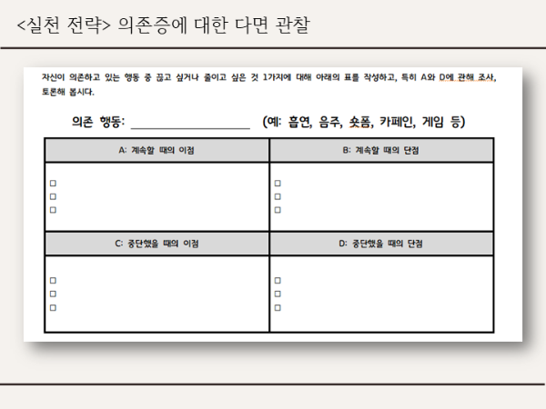 ※ 이 내용은 몇 달 후 ‘다면관찰’이라는 그럴듯한 표로 제작하여, 대학생들을 대상으로 강의를 했고, 흡연, 게임, SNS 등에도 적용하여 학생들의 학습과 시간 관리에 도움을 주게 되었습니다.