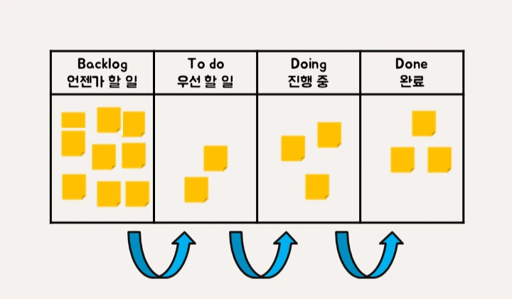 그래서 우선 수북이 쌓여 있는 백로그(Backlog)를 눈에 보이는 곳에 두고, 그중에서 당장, 당분간 해야 하는 일을 몇 개 선정하여 눈에 보이는 또 다른 곳으로 옮겨 놓을 수 있으면 좋습니다.