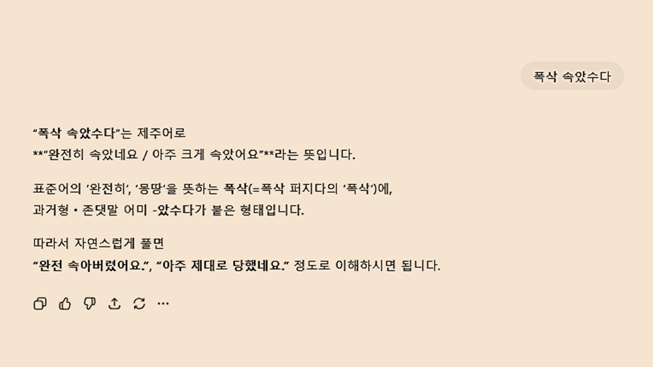 얼마 전 재미있게 봤던 넷플릭스 시리즈의 제목 ‘폭삭 속았수다’를 챗지피티 프롬프트 창에 써 봤습니다.