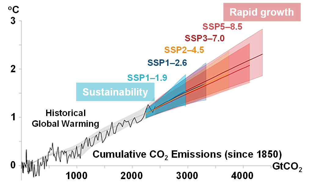 검은 선 및 음영은 1850년을 기준으로 현재까지 얻어진 데이터이고, 유색 실선 및 음영은 향후 인류의 대응 방식에 따른 시나리오라고 이해하면 되겠다.