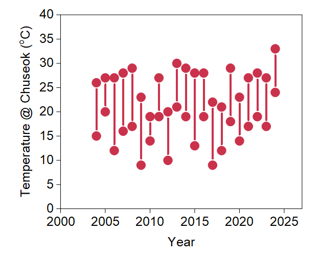 비가 왔다던지, 날씨가 흐렸다던지 하는 등의 이유가 있을 수도 있고, 양력 기준 8-10월까지 다양한 날짜에 추석이 분포하기 때문에, 한 포인트에 대한 데이터로는 연도 별 기온 거동을 설명할 순 없겠다.
