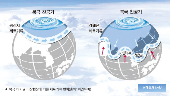 이러한 제트기류가 약해지면서 북극의 찬 공기가 밀고 내려오는 것이다.