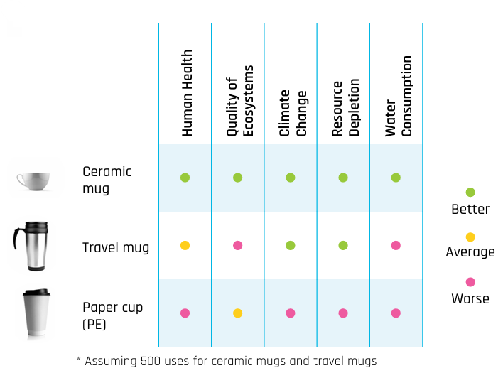 해당 글에서는 일회용 종이컵, 세라믹 머그컵, 스테인리스 텀블러를 비교하였고, 각각의 경우에 대하여 5가지 항목(인간의 건강, 생태계의 질, 기후 변화, 자원 고갈, 물 소비)에 대한 결과치를 예측하였다.