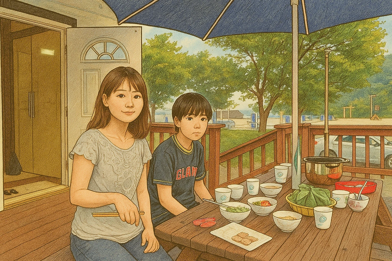 우리는 야외 테이블에 둘러앉아 함께 밥을 먹고, 저녁엔 바베큐 파티를 즐겼다.