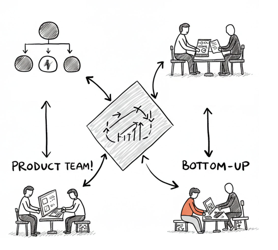 하지만 이러한 기본 원리는 비교적 큰 의사결정에도 동일하게 적용된다. 탑 다운의 장단점으로 돌아가보자. 의사결정이 경직되고 느리게 보일 수 있는 것은 단점이지만, 필요한 정보를 여러 소스로부터 모으기 때문에 종합적인 뷰를 가지고 의사결정할 수 있다는 점은 장점이다. 정보를 여러 소스로부터 모은다. 즉, 제품과 사용자에 대한 정보 역시 탑 다운 의사결정의 범위 안에서 모이고 있다는 것이다. 그리고 그러한 제품과 사용자 정보가 큰 의사결정에 제대로 녹여질 수 있도록 소싱하는 것은 바로 제품팀의 역할, 그 중에서도 PM의 역할이다. 설령 외형적으로 탑 다운 의사결정이 일어나는 것처럼 보이는 구조라 하더라도, 그러한 ‘탑’이 사용자와 제품에 대한 충분한 정보를 가지고 의사결정을 할 수 있도록 끊임없이 제품과 사용자에 대한 인사이트를 던져야 한다. 이러한 제품과 사용자 인사이트의 원천은? 사용자와 제품을 만드는 팀으로부터 나온다. 그렇다.이것의 출발점을 거슬러 올라가보면 바텀 업이다.