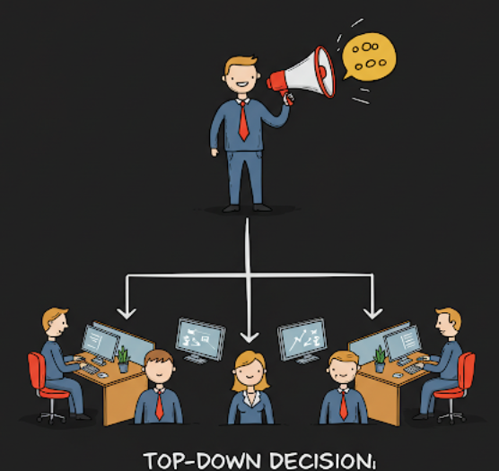 사실 ’바텀 업 의사결정이 모든 것들을 해결해줄 것‘이라는 믿음의 저편에는 탑 다운식 의사결정에 대한 불만의 표현이 숨겨져 있다. 이른바 ‘윗선’에서의 공감하기 힘든 의사결정, 무조건 실행해야 할 것만 같은 상명하복식 업무 흐름, 좋지 않은 결과가 나왔을 때의 부서 간 책임 떠넘기기 등등.
