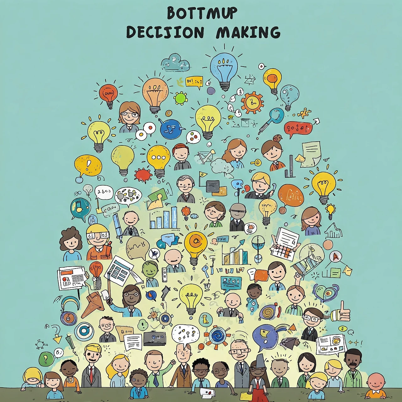 바텀 업 의사결정은 탑 다운의 정확히 반대다. 의사결정의 방향이 아래에서 위로 올라가기 때문에 상향식 의사결정 구조라고도 불린다. 고객과의 최접점을 지니는 제품팀(혹은 개발팀)에서 제품에 대한 온전한 의사결정을 담당하고, 그에 대한 결과를 위주로 경영진이라 리더급과 조율한다.
