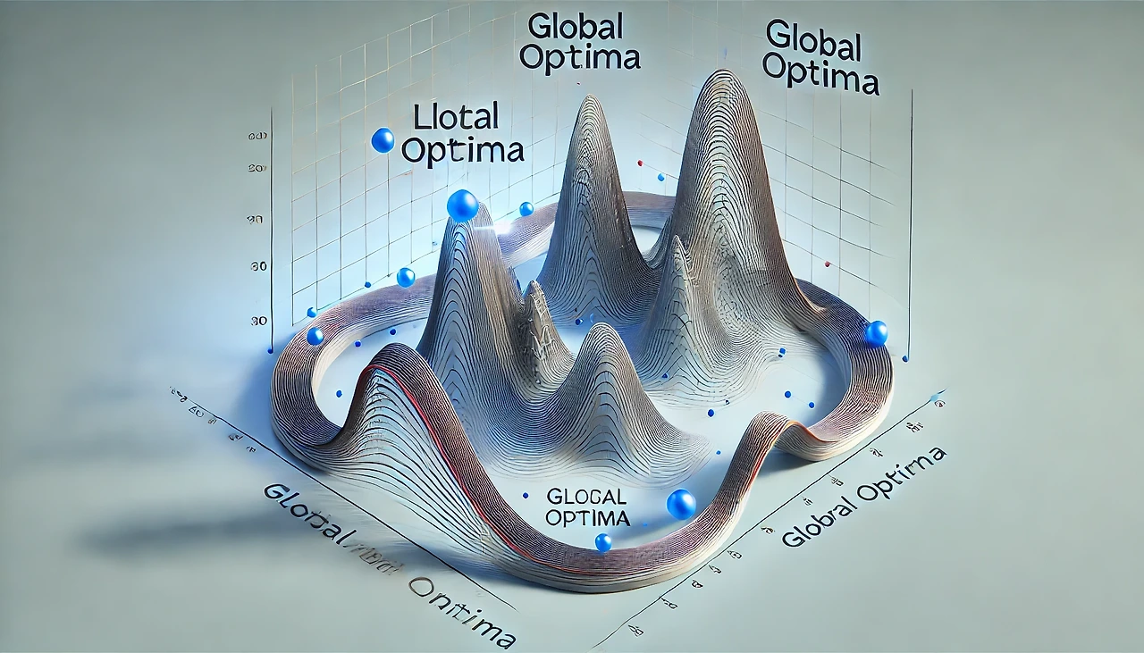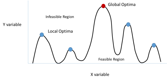 파란색 봉우리들을은 각각 해당 봉우리에서 '가장 좋은(높은)' 해답이 된다. 그 주변의 모든 값들은 파란색 꼭대기보다 낮기 때문이다. 그러나 시야를 넓혀서 보면, 주변에는 더 작은 봉우리도 있고 더 높은 봉우리도 있다. 각각 봉우리의 입장에서 보면 각자의 꼭대기가 최고점(지역 최적점)이지만, 더 넓은 시야에서 보면 빨간색 봉우리가 최고점(전역 최적점)이다.