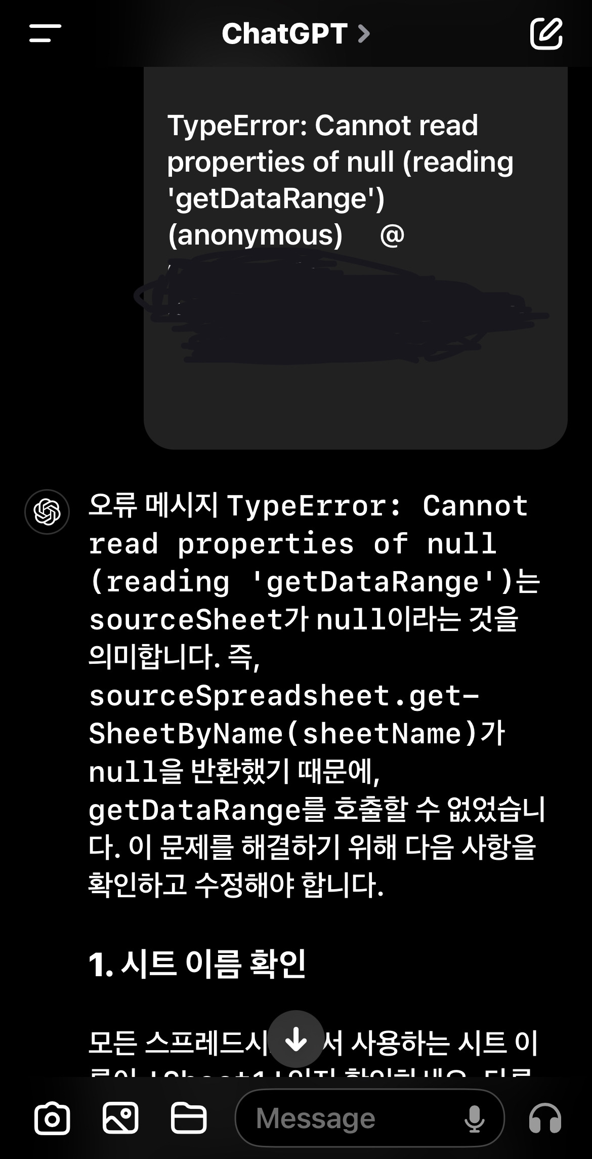 보통 시트에 엑세스 할 때 sheet link가 아닌 sheet id 로 엑세스하는데, 이때 접근하려는 특정 탭 이름도 같이 입력받도록 gpt에게 명령해야 한다. 만일 gpt에게 스크립트를 요청할 때 "특정 시트id의 특정 탭"을 읽으라고 명령하지 않으면 gpt가 탭 name을 스킵하고 응답할 가능성이 매우 큰데, 그럴 경우 스크립트를 실행했을 때 아예 엑세스가 불가하다는 에러 메시지가 뜨게 된다.